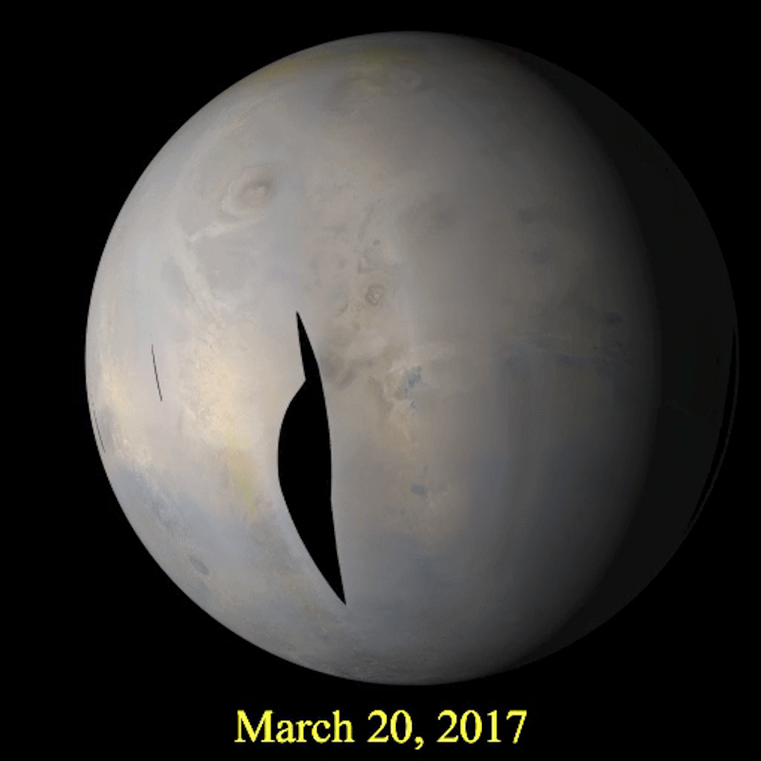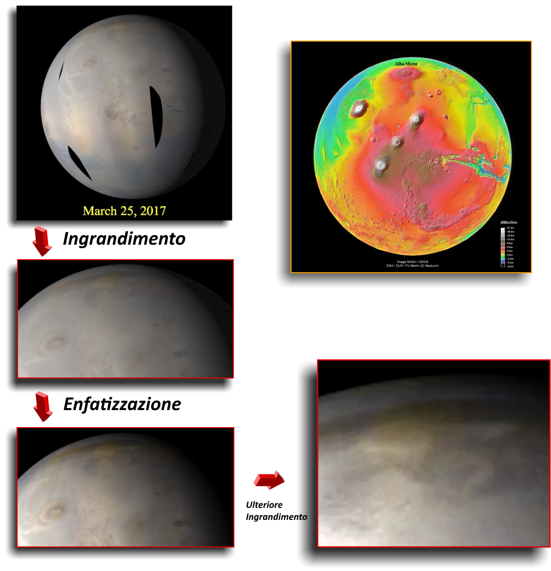 Questi video settimanali possono essere scaricati in formato MP4 (http://www.msss.com/msss_images/subject/weather_reports.html) e successivamente scomposti in singoli fotogrammi. Così facendo, si trova che l'animazione viene costituita da 300 fotogrammi per compiere una rotazione intera del pianeta. In questo modo mi è stato possibile ricomporre un'animazione usando solo il fotogramma in cui Alba Mons transitava sul meridiano centrale dell'immagine, ricavando pertanto sette fotogrammi dal 20 marzo al 26 marzo (vedi: http://www.msss.com/msss_images/2017/03/29/).