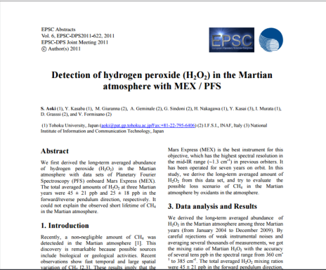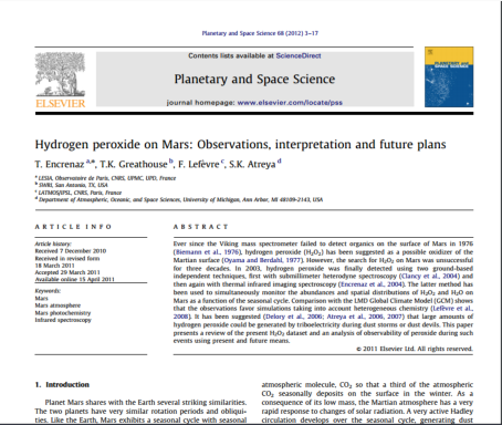 Secondo le stime più recenti la quantità di perossido di idrogeno prodotta dalla foto dissociazione dell’acqua non supera mai le 60 ppb (parti per miliardo), come dire che prendendo una colonna d’aria e condensando tutto il contenuto di acqua ossigenata al suolo otterremo uno straterello di qualche decimo di micron. Infatti, i primi tentativi riusciti di rilevamento spettroscopico hanno dato qualche debole risultato solo a partire dal 2003; PRECEDENTEMENTE NON ERA MAI STATA PRODOTTA NESSUNA PROVA O MISURAZIONE DELL’ESISTENZA DI ACQUA OSSIGENATA SULLA SUPERFICIE MARZIANA.